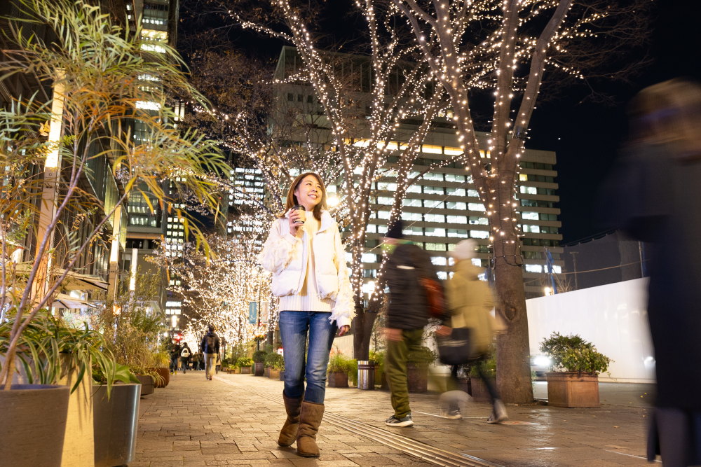 キラキラしたイルミネーションの光やクリスマスの装飾で彩られた街並みを背景に、素敵な写真を撮影しましょう。