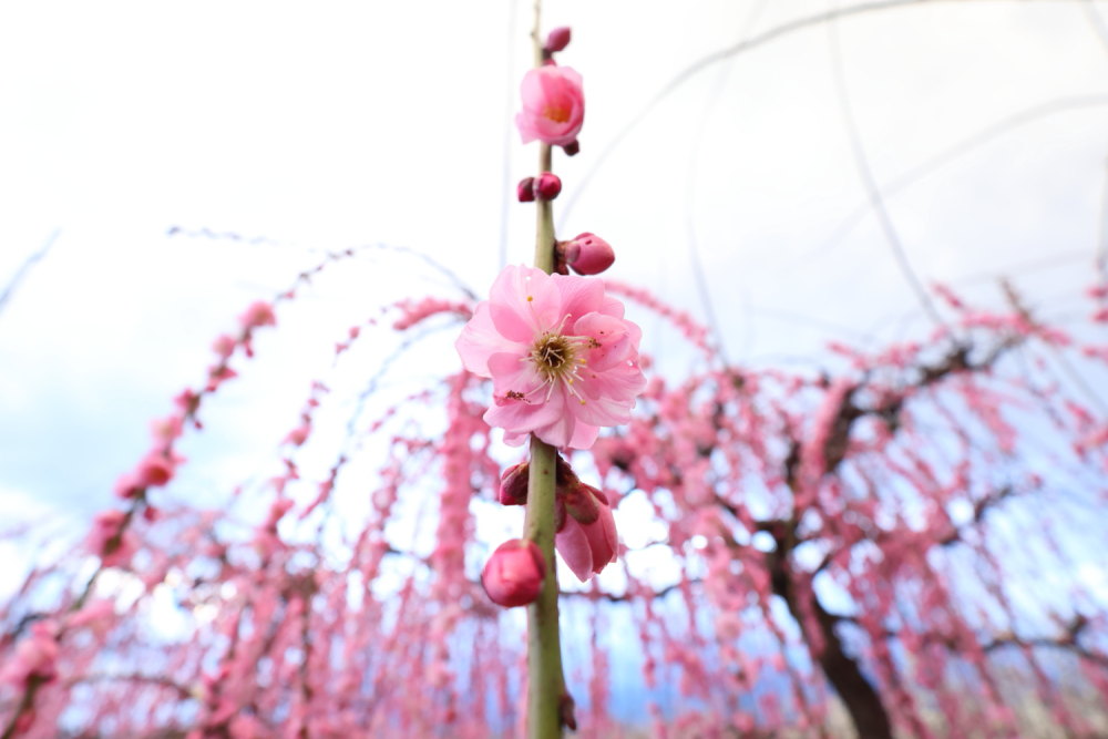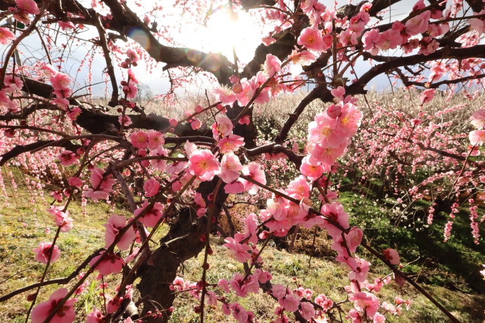 また梅林の背後には山々が広がり、梅の花だけにフォーカスするのではなく、自然との調和が取れた風景撮影も楽しめます。
