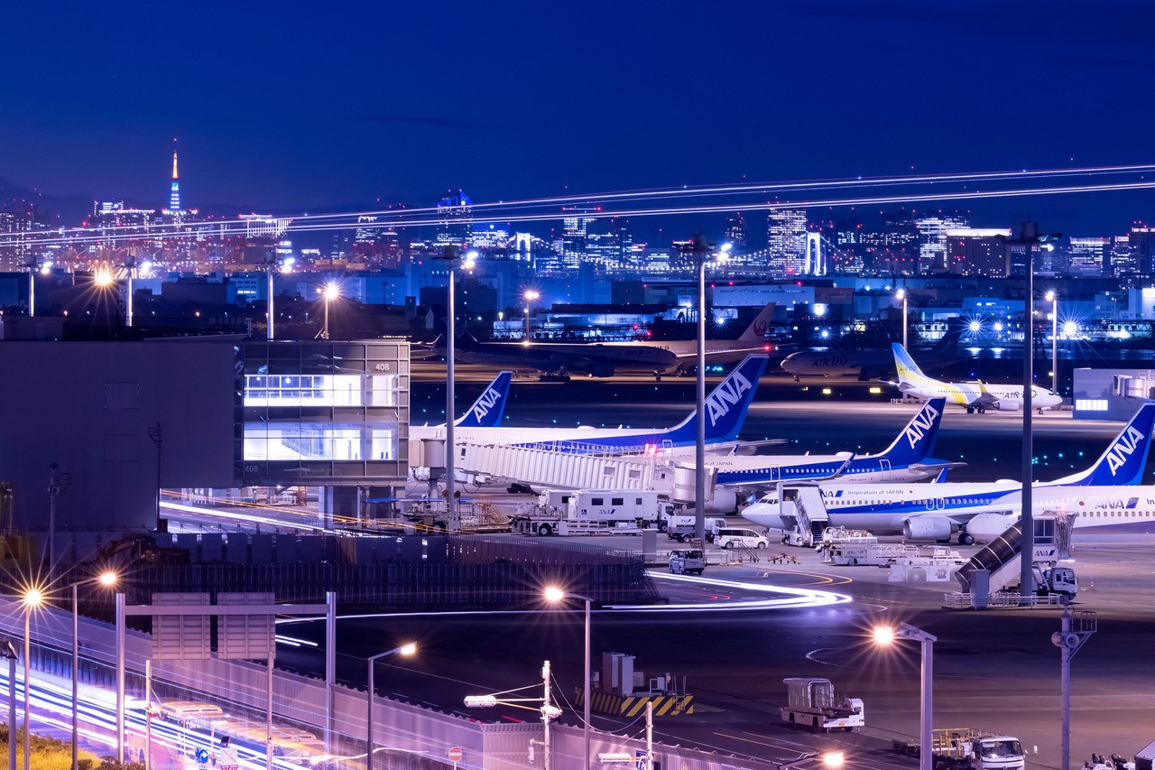 車のヘッドライトや航空機の光が描くラインは、静寂な夜景に圧倒的な躍動感と色彩を与えてくれます。