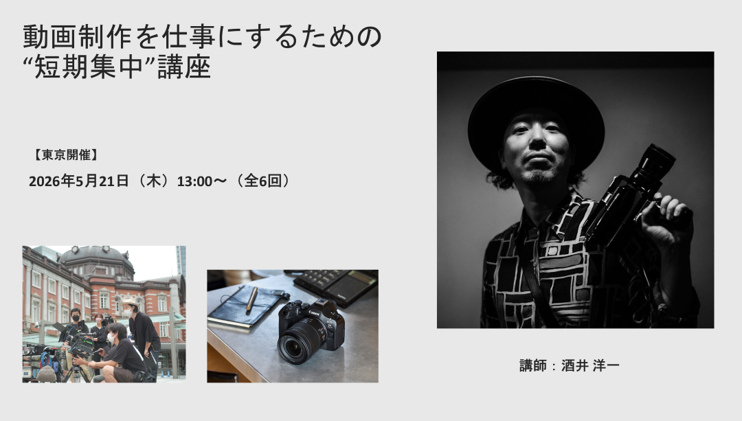 【プロフォトグラファー向け】動画制作を仕事にするための“短期集中”講座 酒井 洋一 教室 5月21日(木) 13:00~17:00 (全6回) 初級
